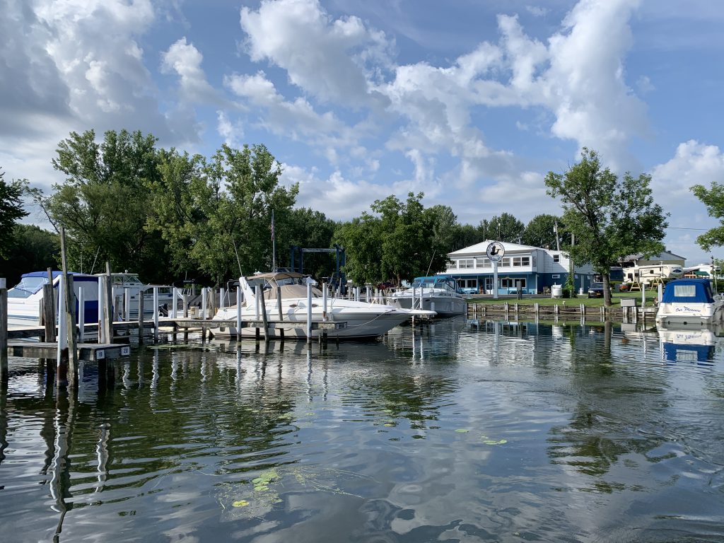 We had to put our great loop adventure on hold for seven weeks while I took care of some business trips. One of the trips was to Great Britain, and the other was to AirVenture in Oshkosh, WI. Both of these were awesome adventures by themselves. While we were away we stored the boat at Pirate’s Cove Marina near Syracuse, NY. They took good care of Blue Sky in our absence. They even sent us pictures of the boat several times.
